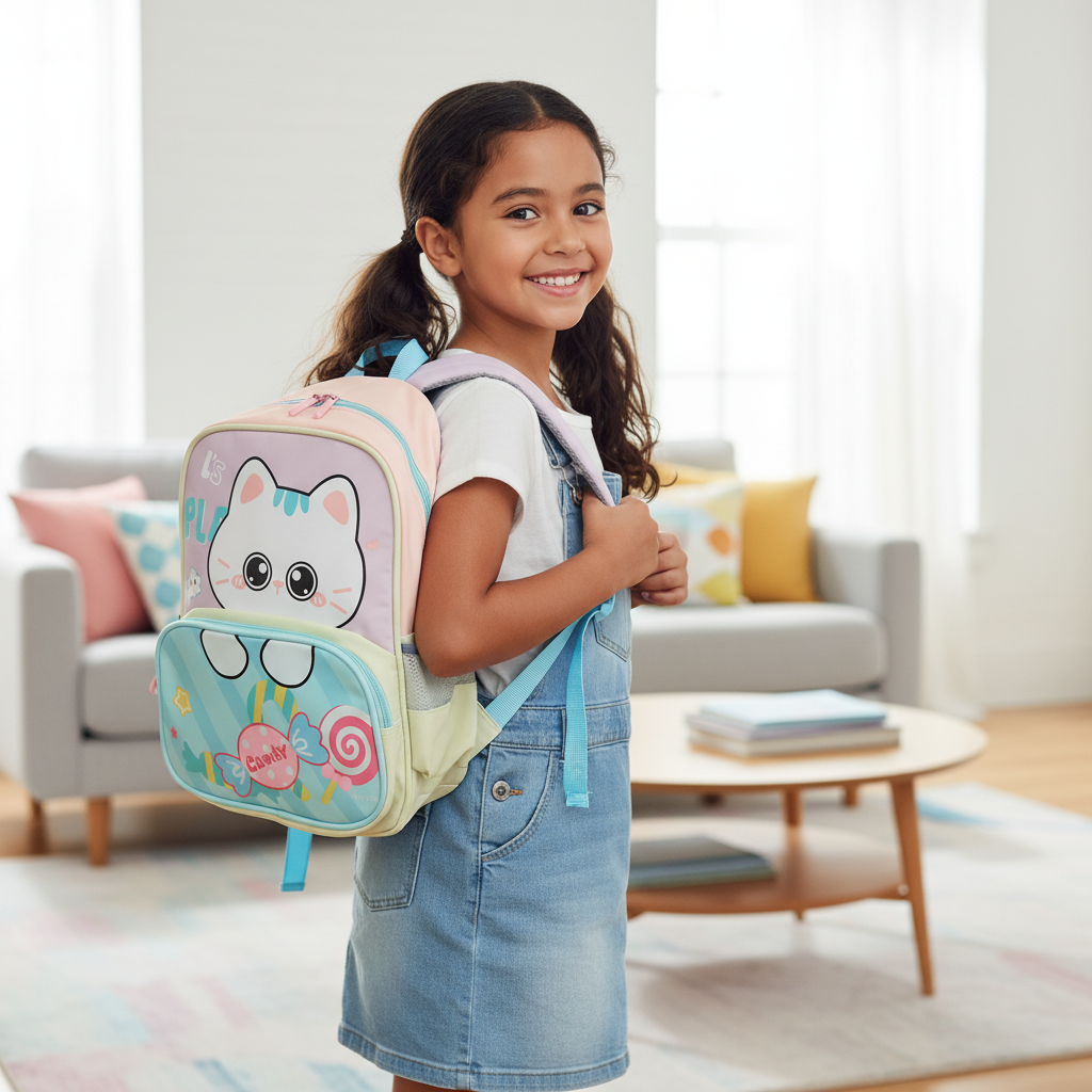 Cute Cat & Candy Graphics – Features a large, friendly kitten graphic and a sweet-themed print on the lower pocket.